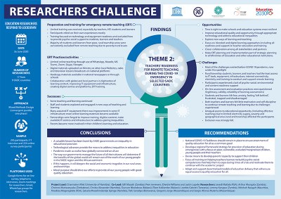 This theme will explore teachers’ preparedness to continue supporting learning during major disruptions using a range of distance learning approaches, including but not limited to ICTs. This research will recognize that the extraordinary demands placed on teachers during moments of disruption include helping parents support students, attending to the social and emotional wellbeing of students as well as their health, safety, and nutrition needs.