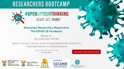 Conceptualised by: Nadine Petersen, University of Johannesburg (UJ), Maureen Robinson (SU), Stellenbosch University, Carisma Nel, North West University (NWU), Carol Bertram, University of KwaZulu Natal (UKZN), Jackie Batchelor, University of Johannesburg, Moeniera Moosa, University of Witwatersrand, Tanya Bekker, University of Witwatersrand, Sarita Ramasroop, University of Johannesburg, Jacques Du Plessis, University of Witwatersrand, Dale Langsford. University of Witwatersrand, Emmanuel Mushayikwa, University of Witwatersrand