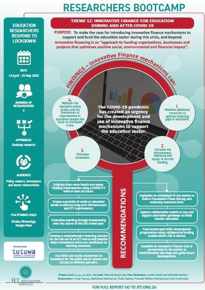 | Read the report published by JET and UCT GSB Bertha Centre for Social Innovation and Entrepreneurship with support from the Tutwa Foundation and Impact Investing South Africa: New funding flows: Innovative finance for education during and after COVID-19 |